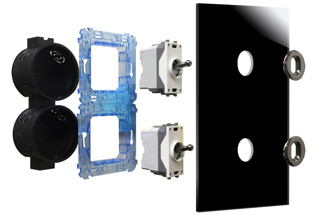 Die Montage der Retroschalter erfolgt in vorhandenen Wanddosen mit 2 Schrauben (Lieferung ohne Wanddosen). Wanddosen-Tiefe min. 45 mm. Abhängig von der ausgewählten Variante wird entweder ein Kipphebel oder zwei Kipphebel nebeneinander in der Wanddose installiert. Erforderliches Installationsmaterial wird automatisch und kostenfrei mitgeliefert.