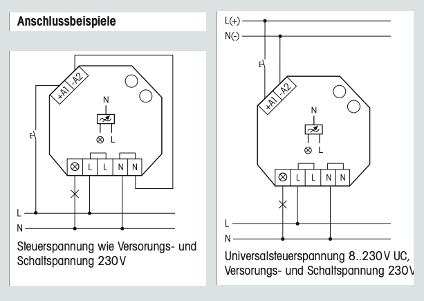 Universal-Steuerspannung 8..230V UC, galvanisch getrennt von der Versorgungsund Schalt-spannung 230V. Kurze Steuerbefehle schalten ein/aus, permanente Ansteuerung verändert die Helligkeit bis zu dem maximalen Wert. Eine Unterbrechung der Ansteuerung ändert die Dimmrichtung. Die eingestellte Helligkeitsstufe bleibt beim Ausschalten gespeichert (Memory).